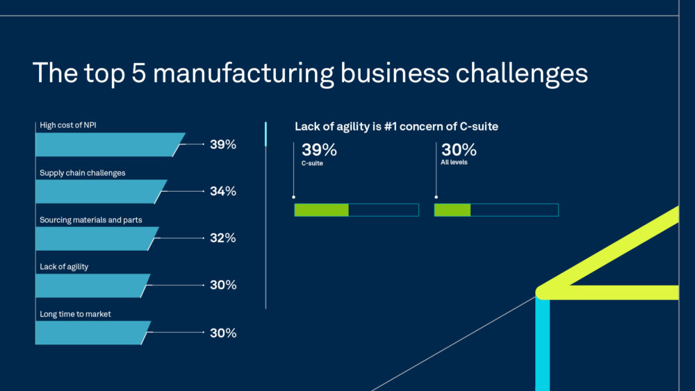 It is my belief from analysing the findings, that increasing agility doesn’t have to be a slow process. Insights play a vital role. Whether it’s the high cost of new product introduction (NPI) which is the top standalone business challenge of our sector, rigid manufacturing processes which are reported as a barrier by 39%, or the ability to respond to market shocks – we each need to marry our strengths and weaknesses with successful strategies and investments so we can shape flexibility in a way that matches our business needs.